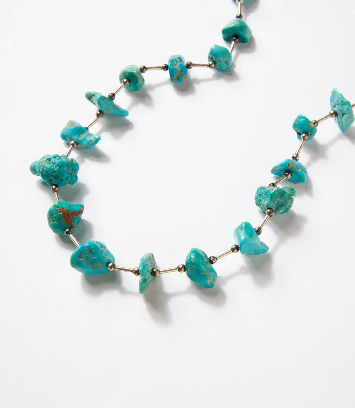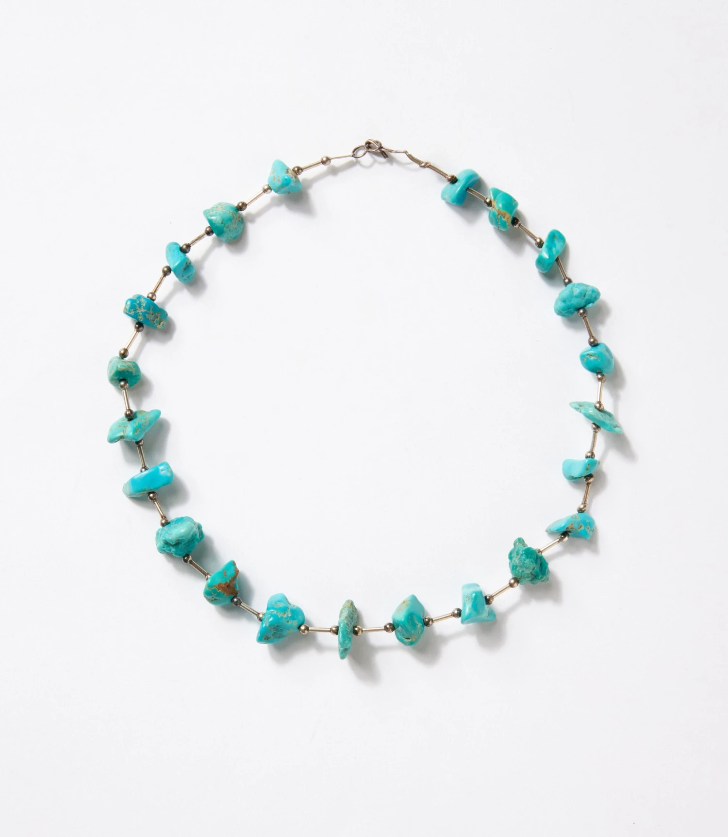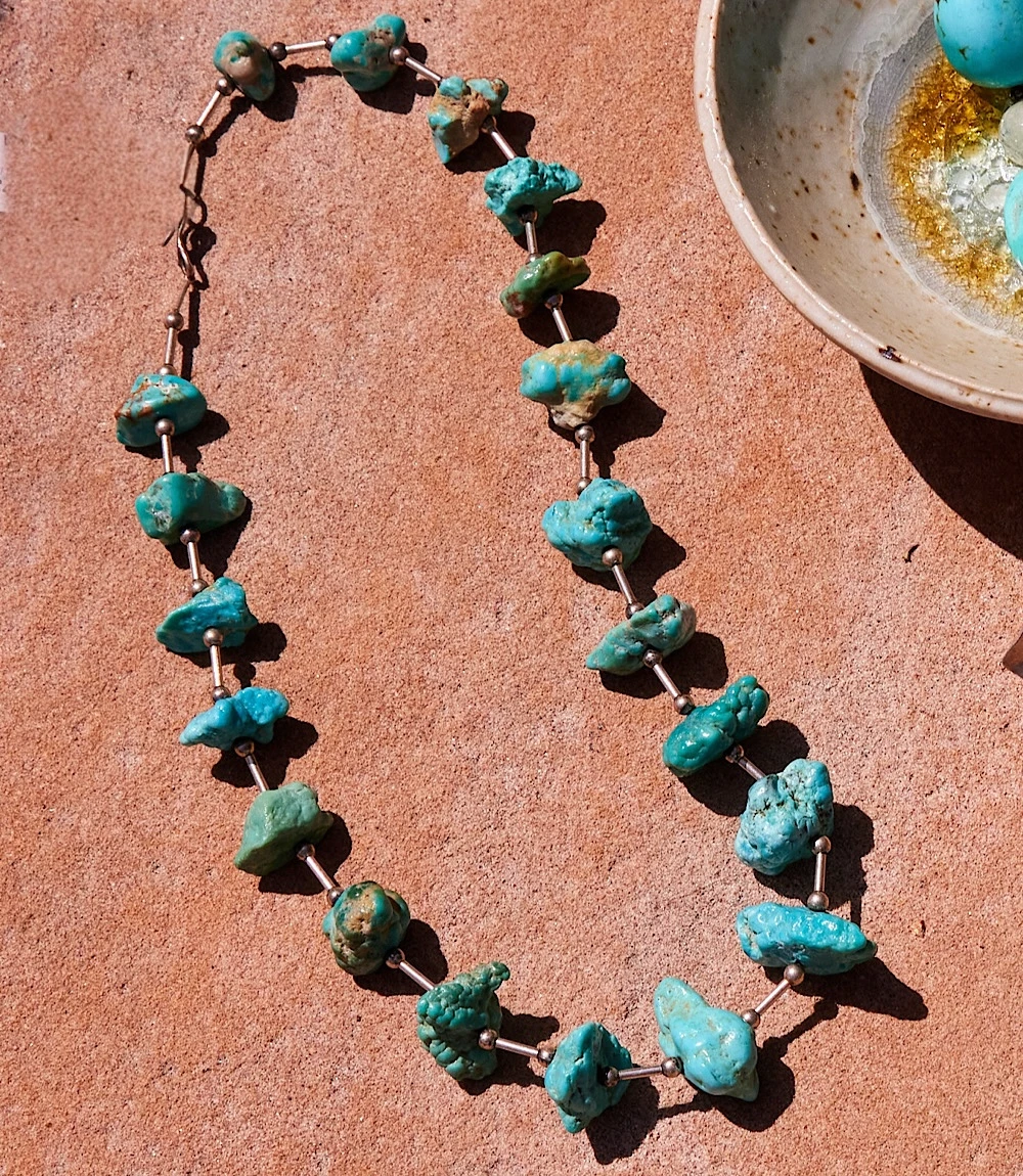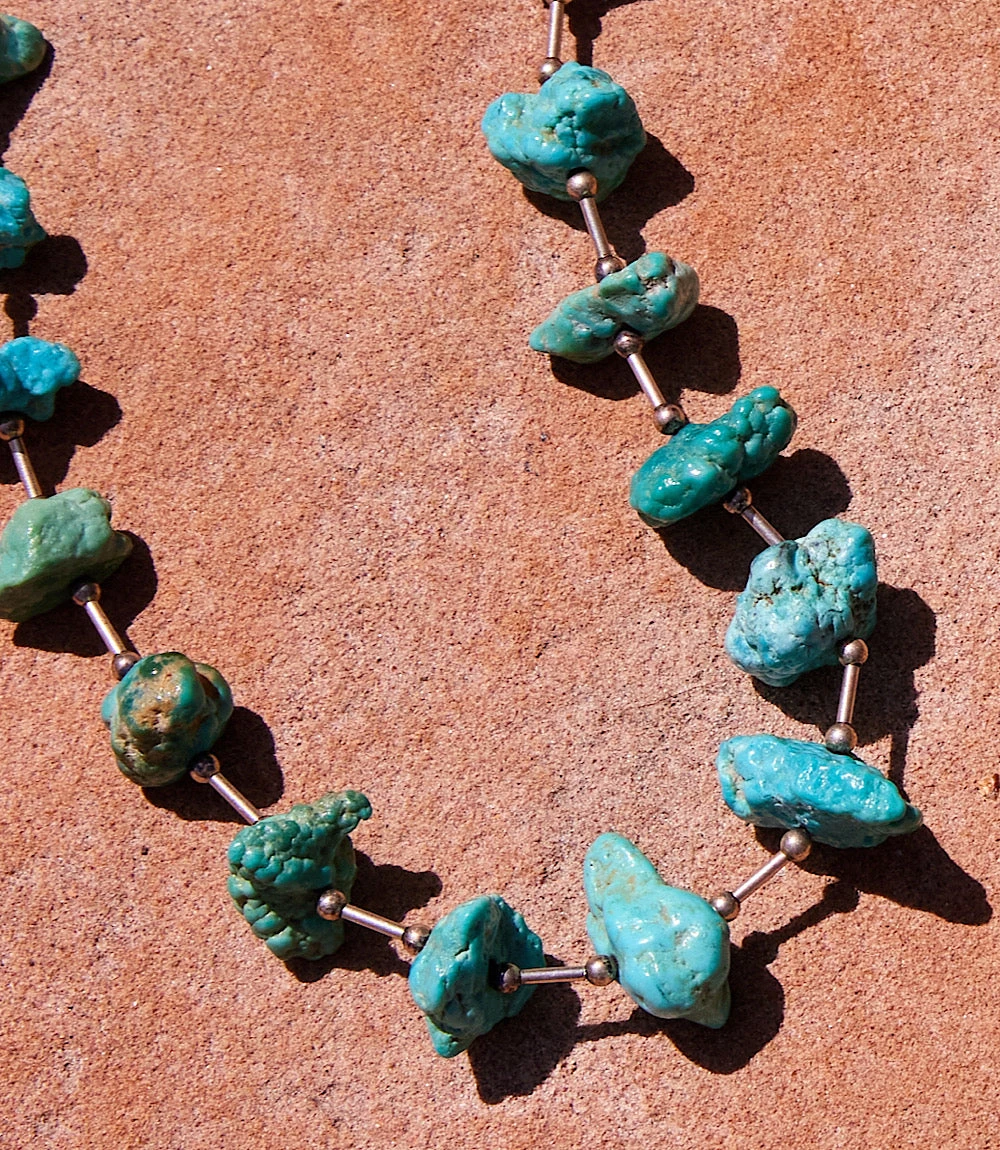 The Antique Turquoise Necklace celebrates natural texture and bold color with raw turquoise nuggets spaced by slender sterling silver links and delicate bead accents. The contrast between the rugged stones and polished metal creates a look that’s both earthy and refined. Finished with a classic hook-and-eye closure, this piece showcases timeless craftsmanship with a rustic elegance.
