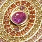 Radiating with warmth and sparkle, this necklace features a circular pendant encrusted with pink cubic zirconia and a vibrant red center stone. Crafted from brass with a 14K gold plate and suspended on a delicate beaded chain, it’s a bold yet elegant piece that adds a refined pop of color to any look.