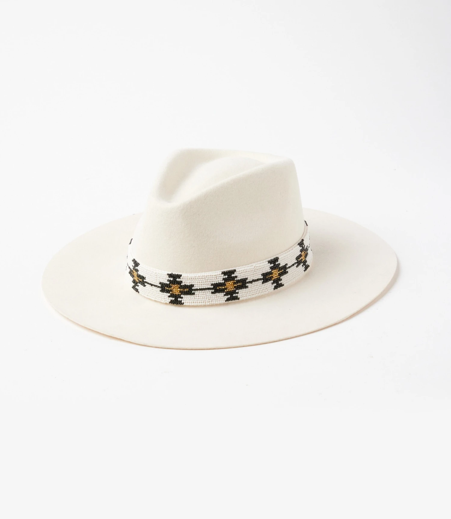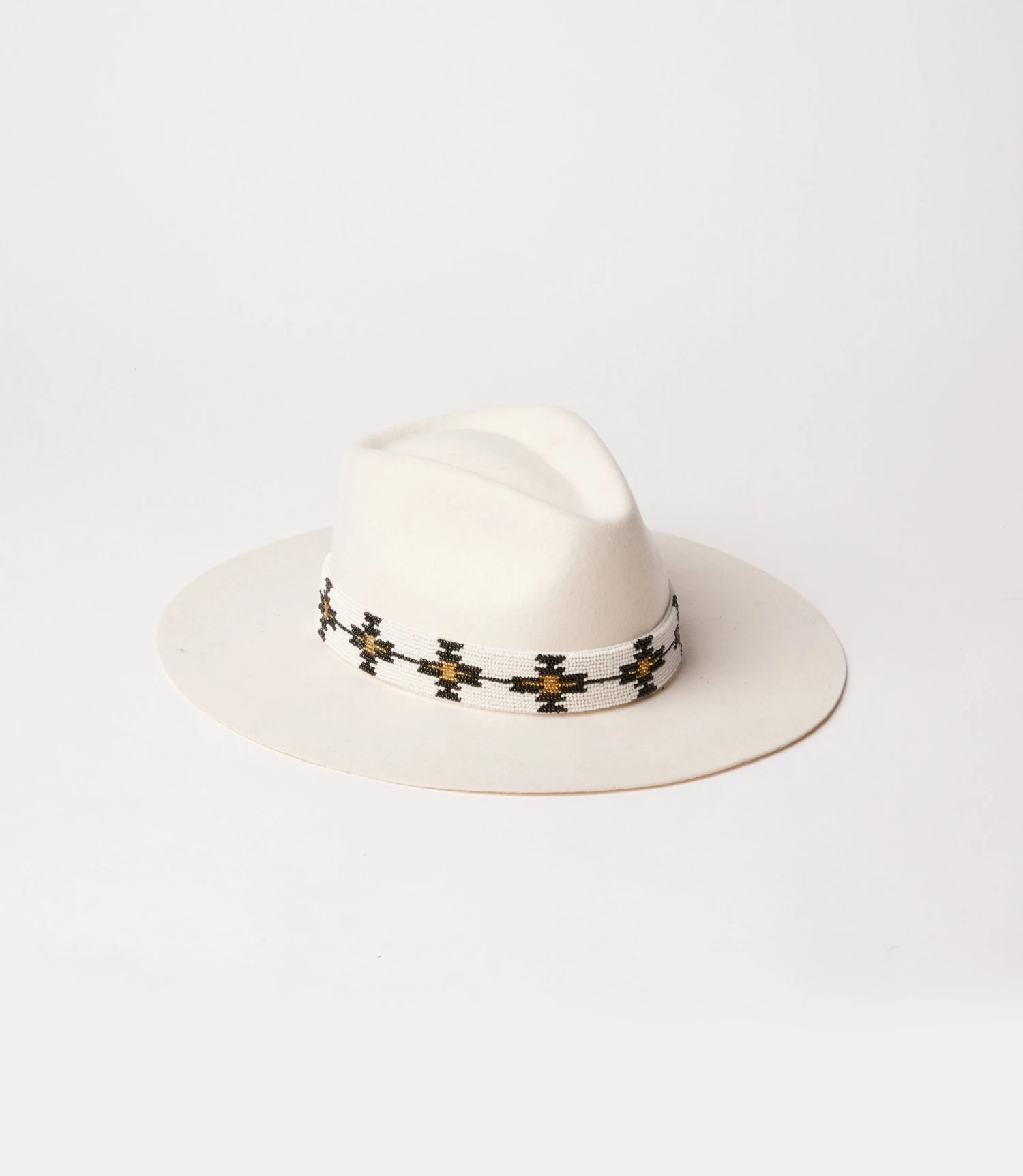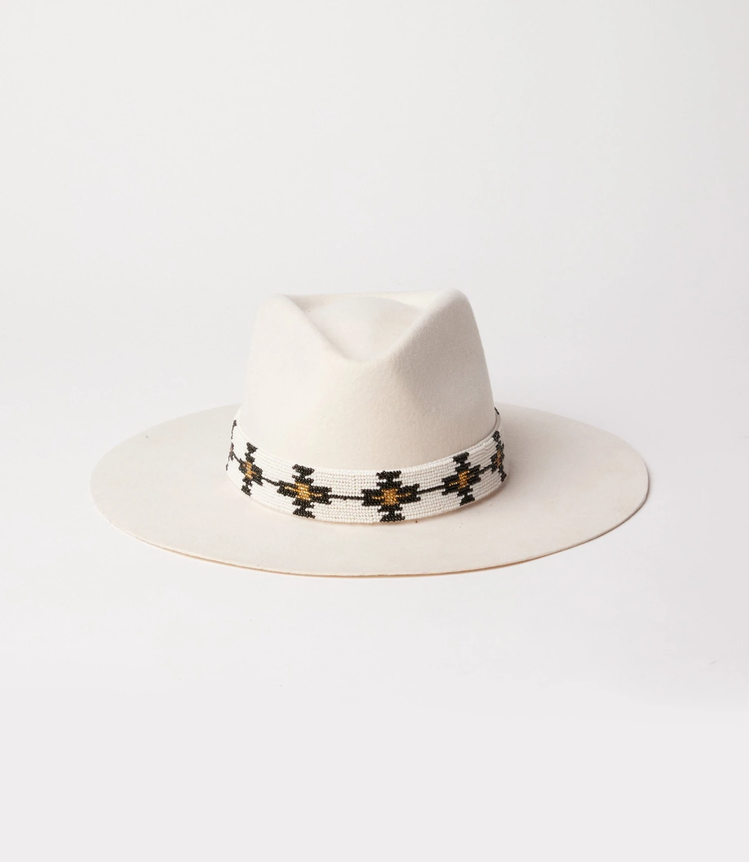 Constructed from virgin wool, this ivory rancher hat features a well-defined crown and a sturdy form that preserves its classic shape. The hand-beaded trim, carefully crafted by expert artisans, provides an intricate, artisanal detail to this refined piece. Virgin wool consists of raw fibers directly obtained from sheep, untouched by any manufacturing or recycling prior to use.