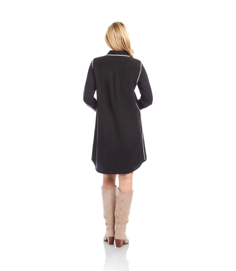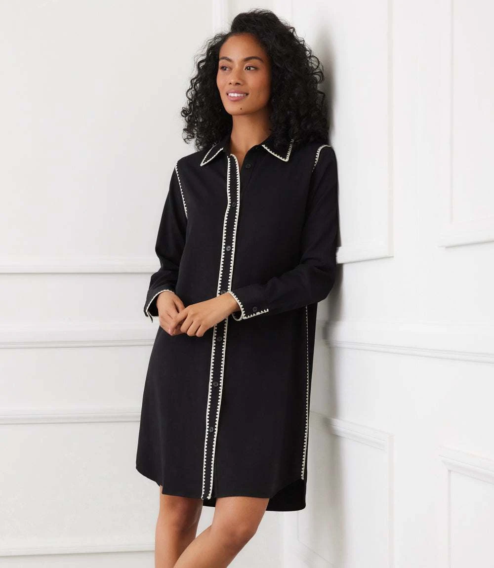 This long sleeve shirtdress features contrast edge stitching along the collar, placket, and cuffs. Designed with a classic shirt collar and button front, it offers a streamlined silhouette that works effortlessly from day to night.