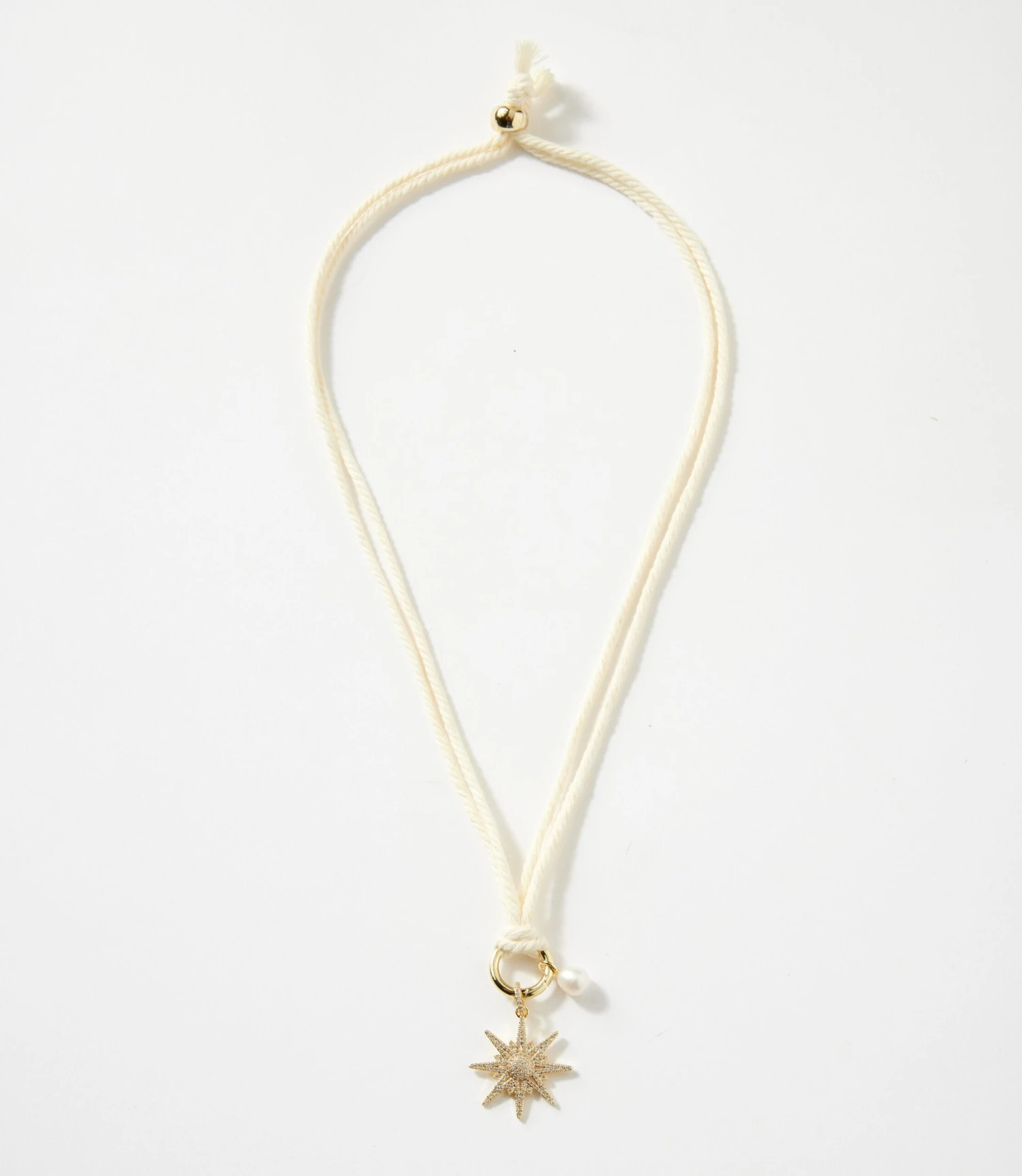Illuminate your look with this cream cotton cord necklace featuring a sparkling pavé starburst charm and a delicate pearl accent. Finished with gold plating, it brings a soft, celestial elegance to any outfit. The adjustable cord closure ensures a comfortable, customizable fit.