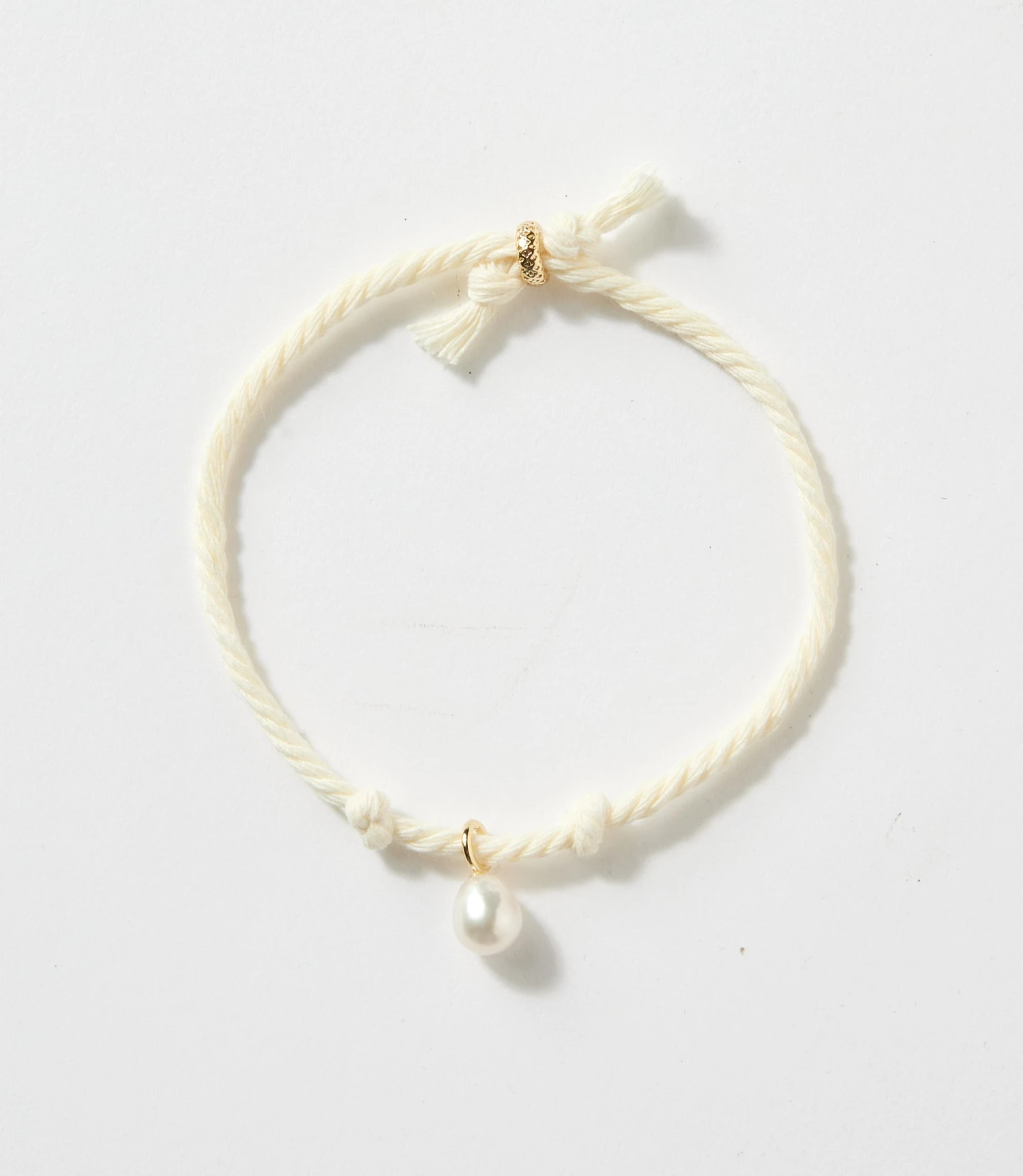 Delicate and timeless, this cream cotton cord bracelet is accented with a luminous freshwater pearl drop framed with a subtle gold detail. The braided cord features an adjustable closure for a customizable fit, making it perfect for layering or wearing solo for understated sophistication.