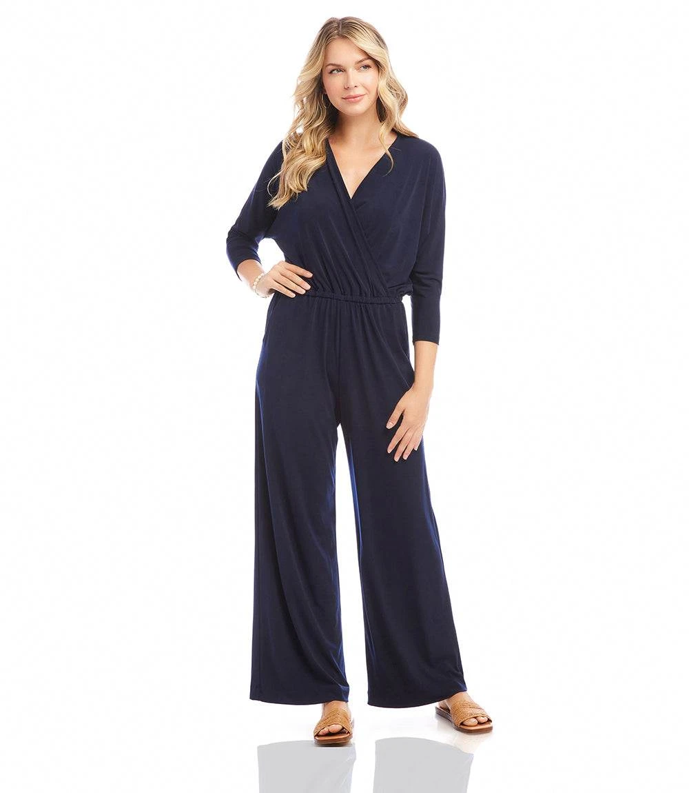 This sleek jumpsuit is crafted from smooth, wrinkle-resistant travel jersey that moves with you. It features a surplice V-neckline with crossover detail, 3/4-length sleeves, and a stretchy elastic waistband that offers a flattering fit. Side pockets add everyday ease, while the wide-leg, full-length silhouette keeps the look modern and effortless—perfect for travel, work, or weekend plans.