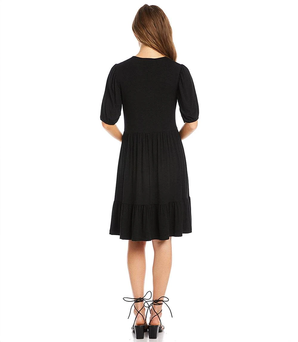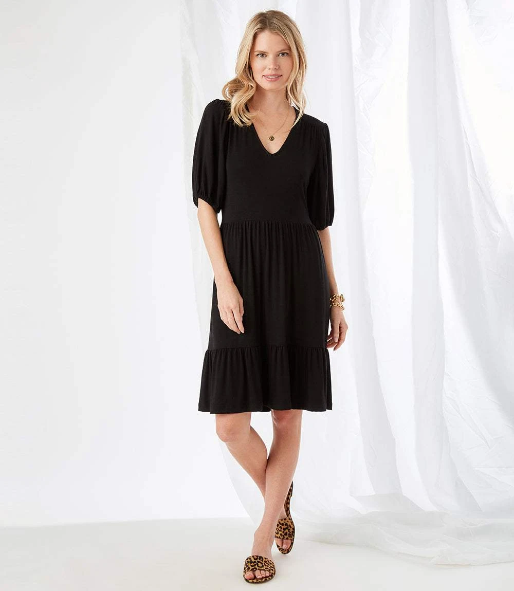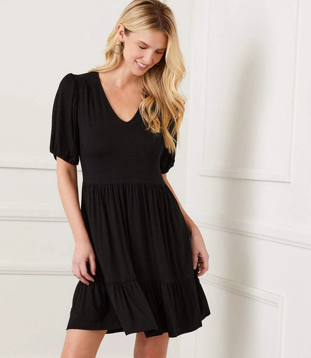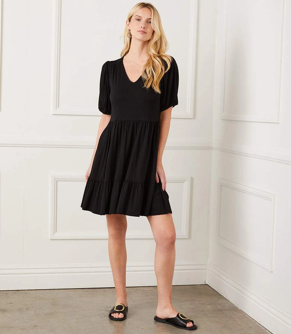 This V-neck dress features soft puff sleeves and a breezy two-tiered skirt for easy movement and flow. Made from a comfortable rayon spandex jersey, it offers the perfect mix of stretch and drape. The short sleeves and relaxed silhouette make it an effortless pick for warm days or casual nights out.