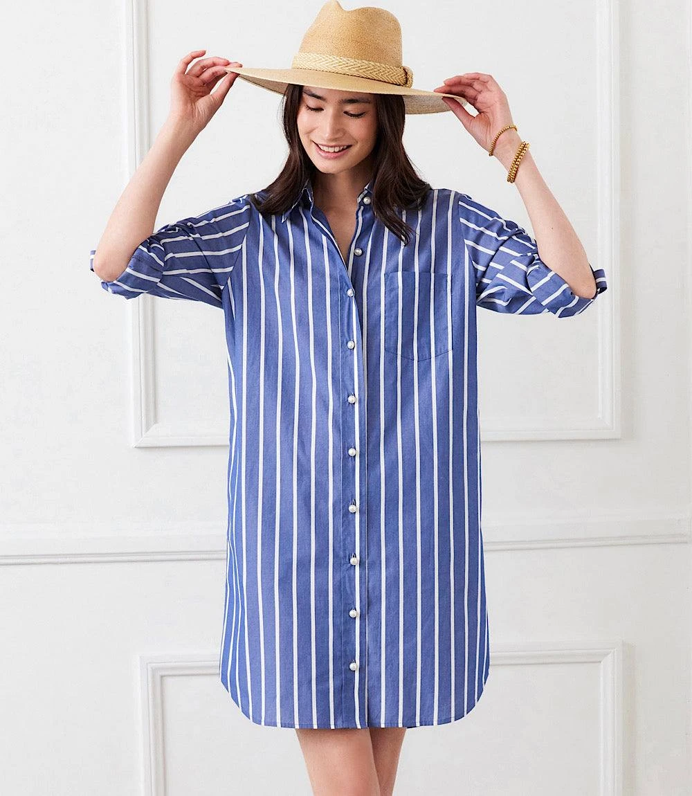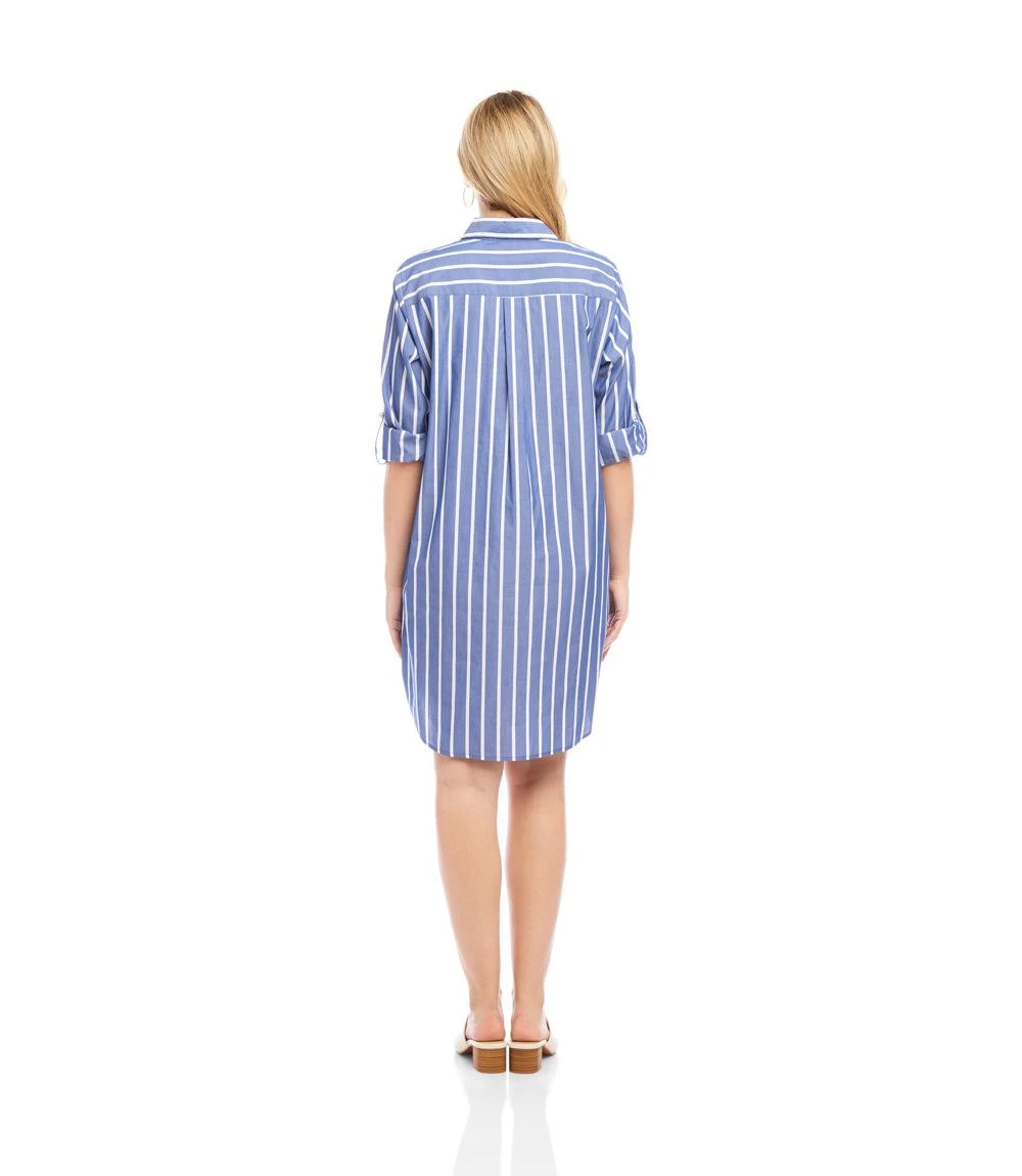 Set against a soft blue background with crisp white stripes, this relaxed-fit dress features roll-tab sleeves, a pearl button front, and a classic collared neckline. A single chest pocket and two side pockets add functional charm, making it the perfect piece for laid-back days and polished outings alike.