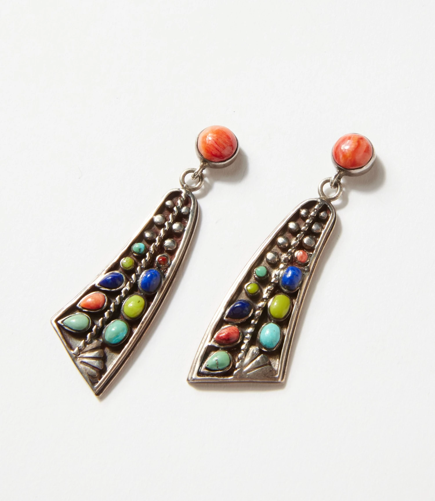 This striking set features a bold V-shaped collar necklace paired with matching drop earrings, all inlaid with a vibrant mosaic of turquoise and multicolored gemstones. The necklace is crafted in three articulated sections, allowing it to drape naturally along the collarbone for a comfortable fit. Intricate sterling silver detailing adds texture and dimension, while a secure lobster clasp ensures reliable wear.