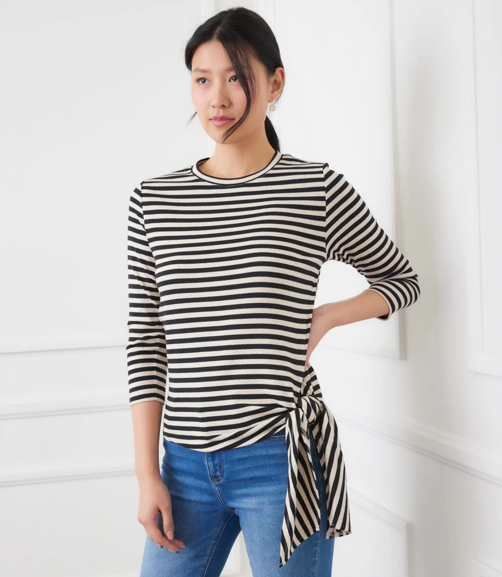 This top features a crew neckline and is crafted from striped cotton knit fabric. It includes 3/4 length sleeves and a side-tie detail, offering both style and ease of wear.