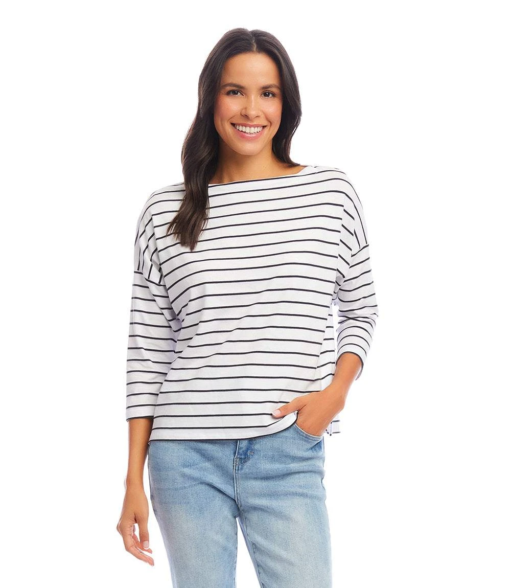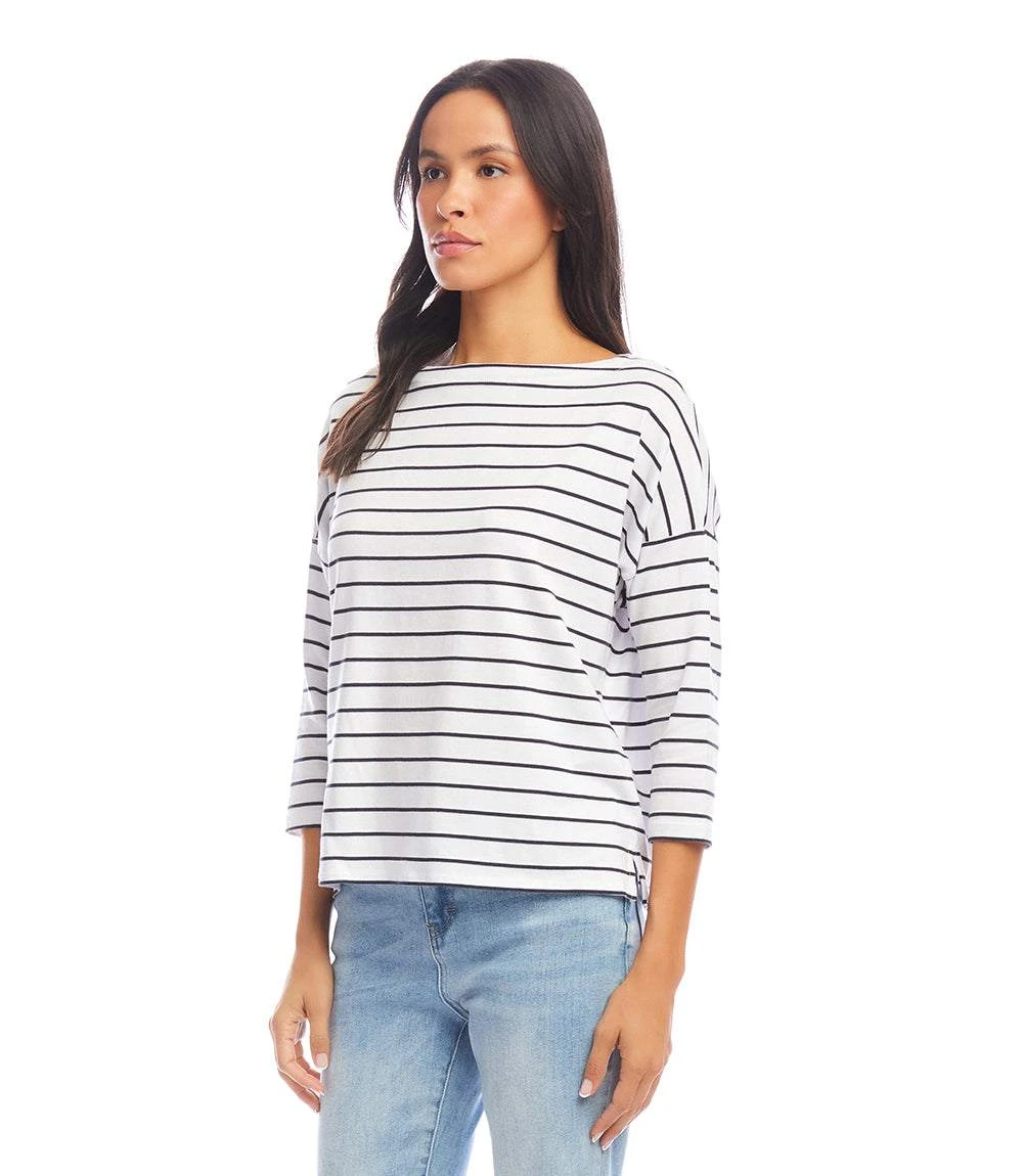 This relaxed-fit white and black stripe top features a flattering boatneck design, perfect for a casual and effortless look. Its navy stripes offer a classic touch, while providing a versatile addition to your wardrobe.